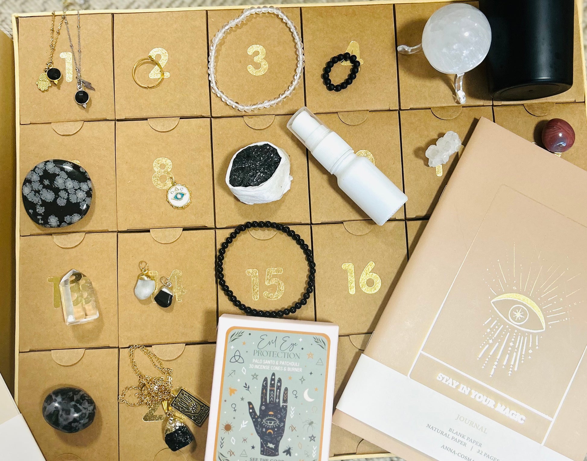 Mit hochwertigen Ritualtools, Schmuckstücken, Kristallen, Räucherwaren und liebevoll ausgewählten Überraschungen.