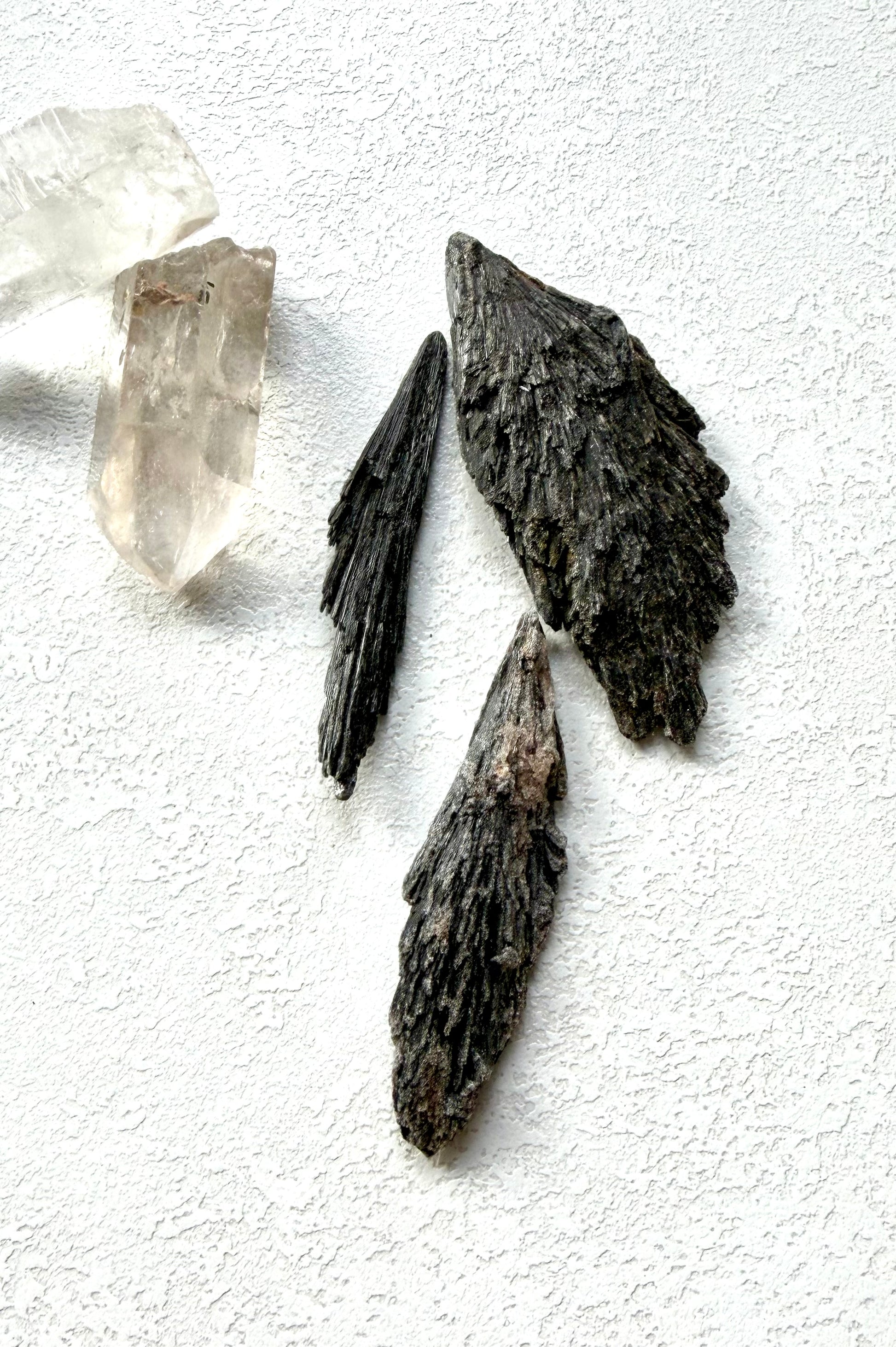 Schwarzer Kyanit ist ein außergewöhnlicher Kristall mit einer natürlich fächerartigen Struktur, die an einen kleinen energetischen Besen erinnert. Seine Form entsteht ganz von selbst im Wachstum des Steins – roh, unverfälscht und voller ursprünglicher Kraft.