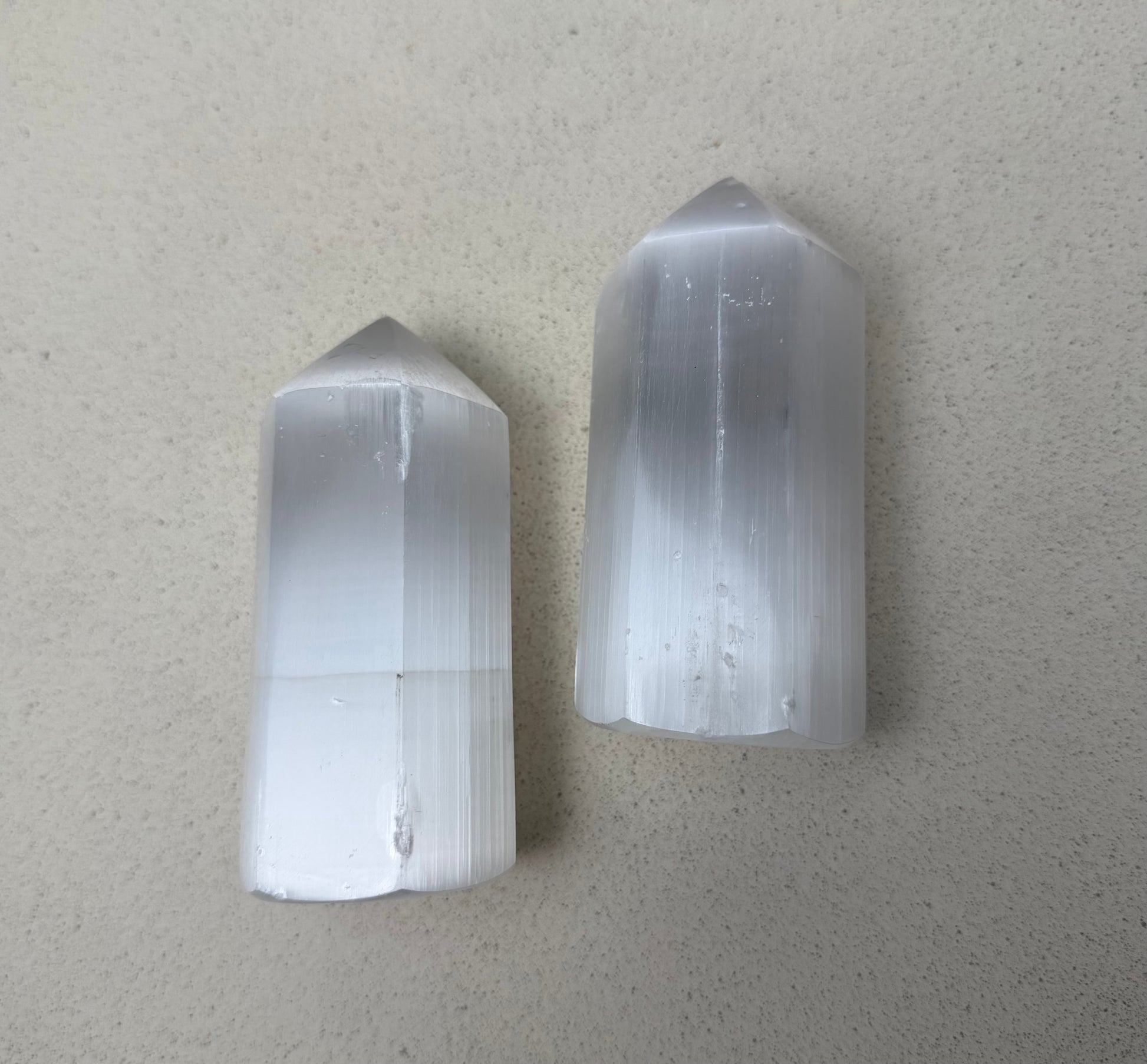 A- A Qualität B- Leicht mattierte Selenitspitzen – optisch sanft, materialisch unversehrt.