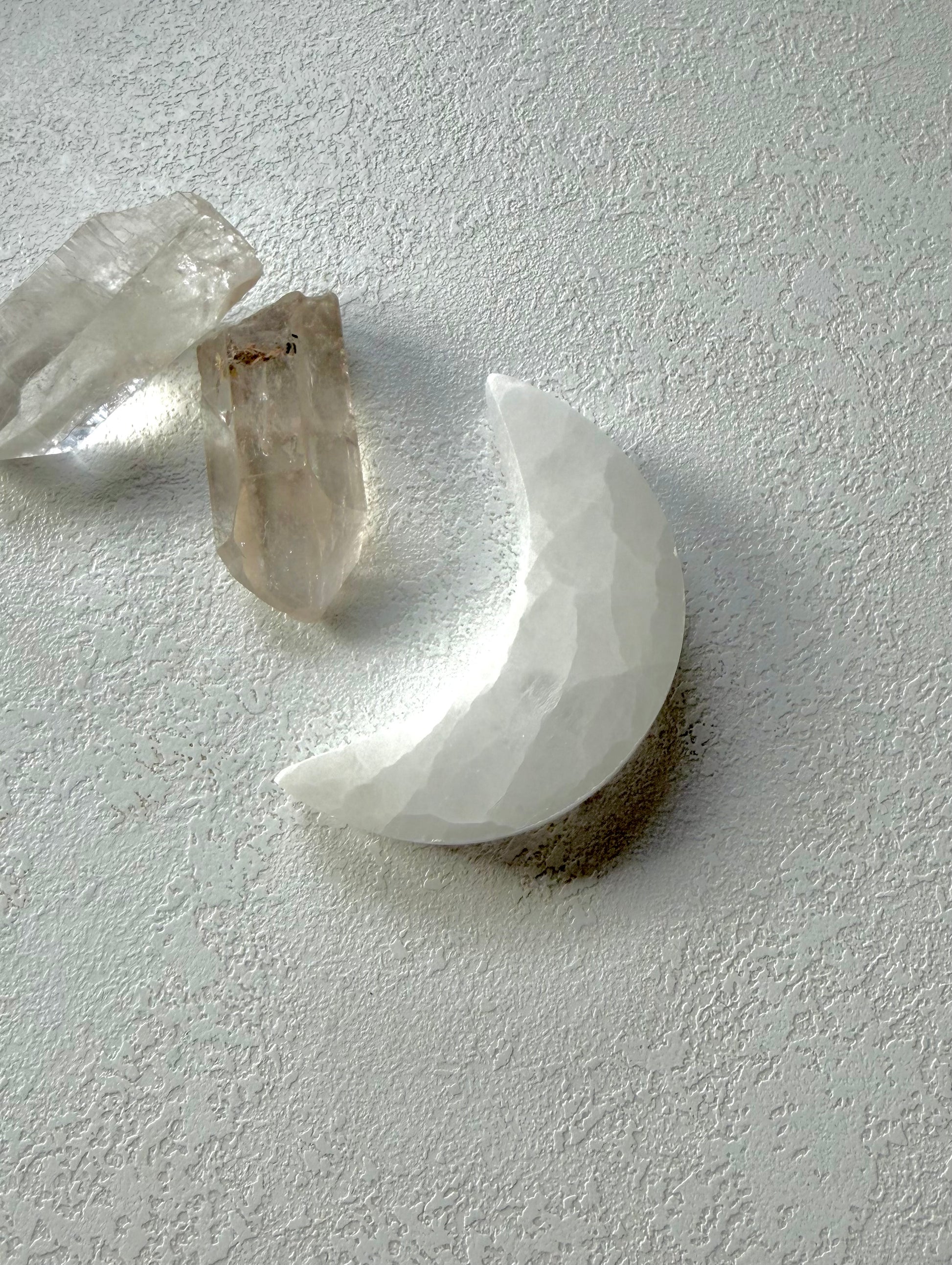 Der Selenit-Mond verbindet die sanfte, lichtvolle Energie dieses Kristalls mit der symbolischen Kraft des Mondes. Seine milchig-weiße Struktur wirkt ruhig, klar und fast schwerelos – wie eingefangenes Mondlicht in Steinform.