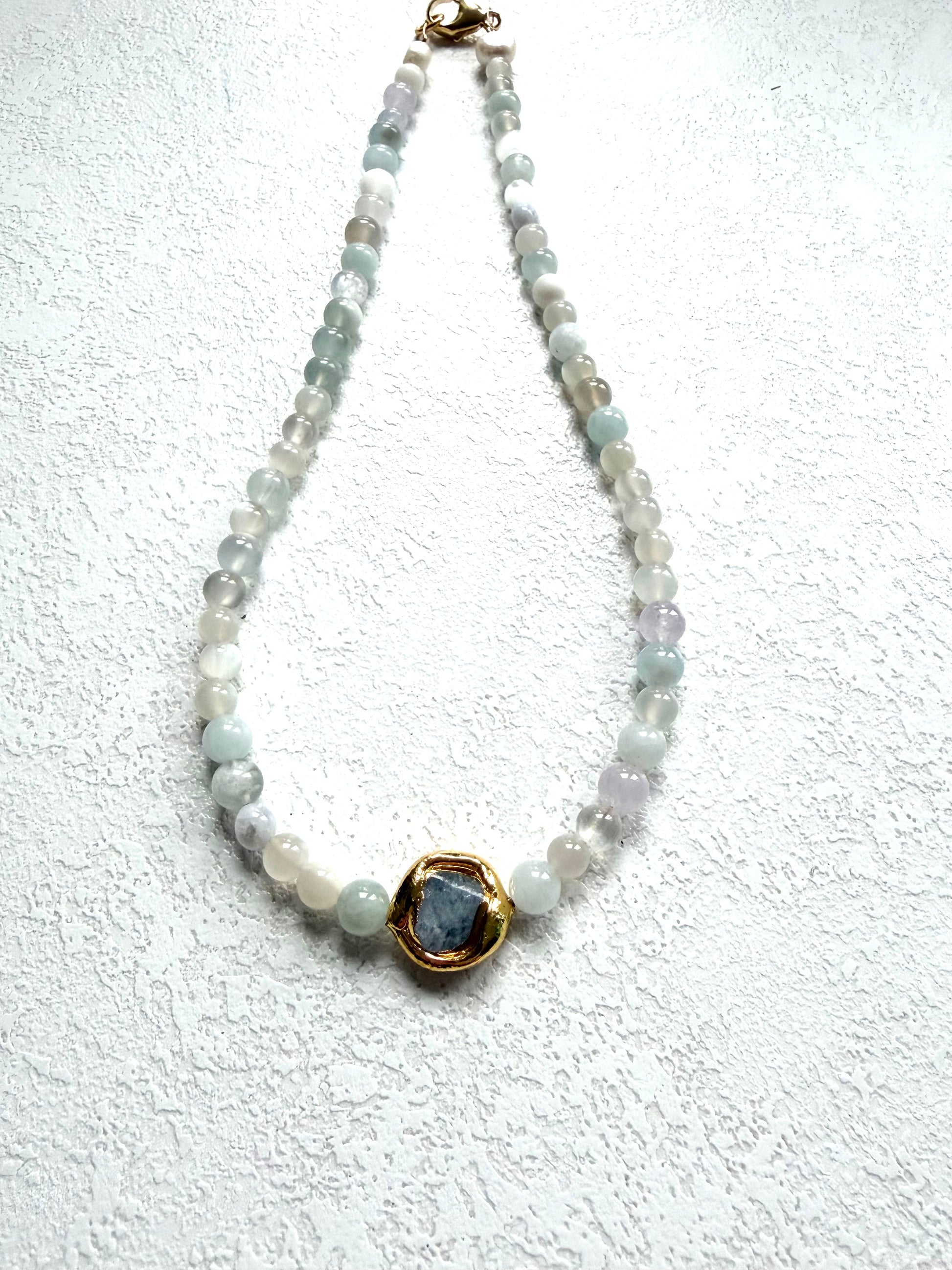 Chalcedon und Aquamarin unterstützen sanfte Kommunikation, Kyanit bringt innere Stärke und Fokus.
