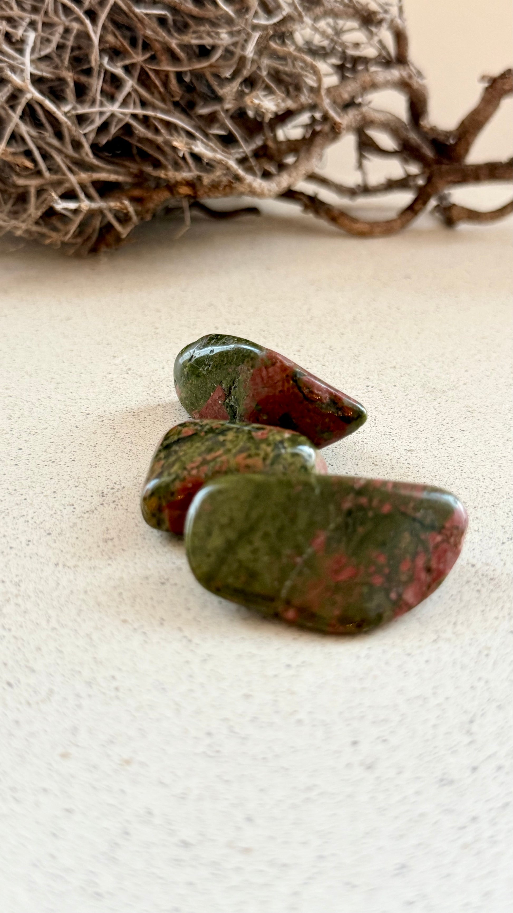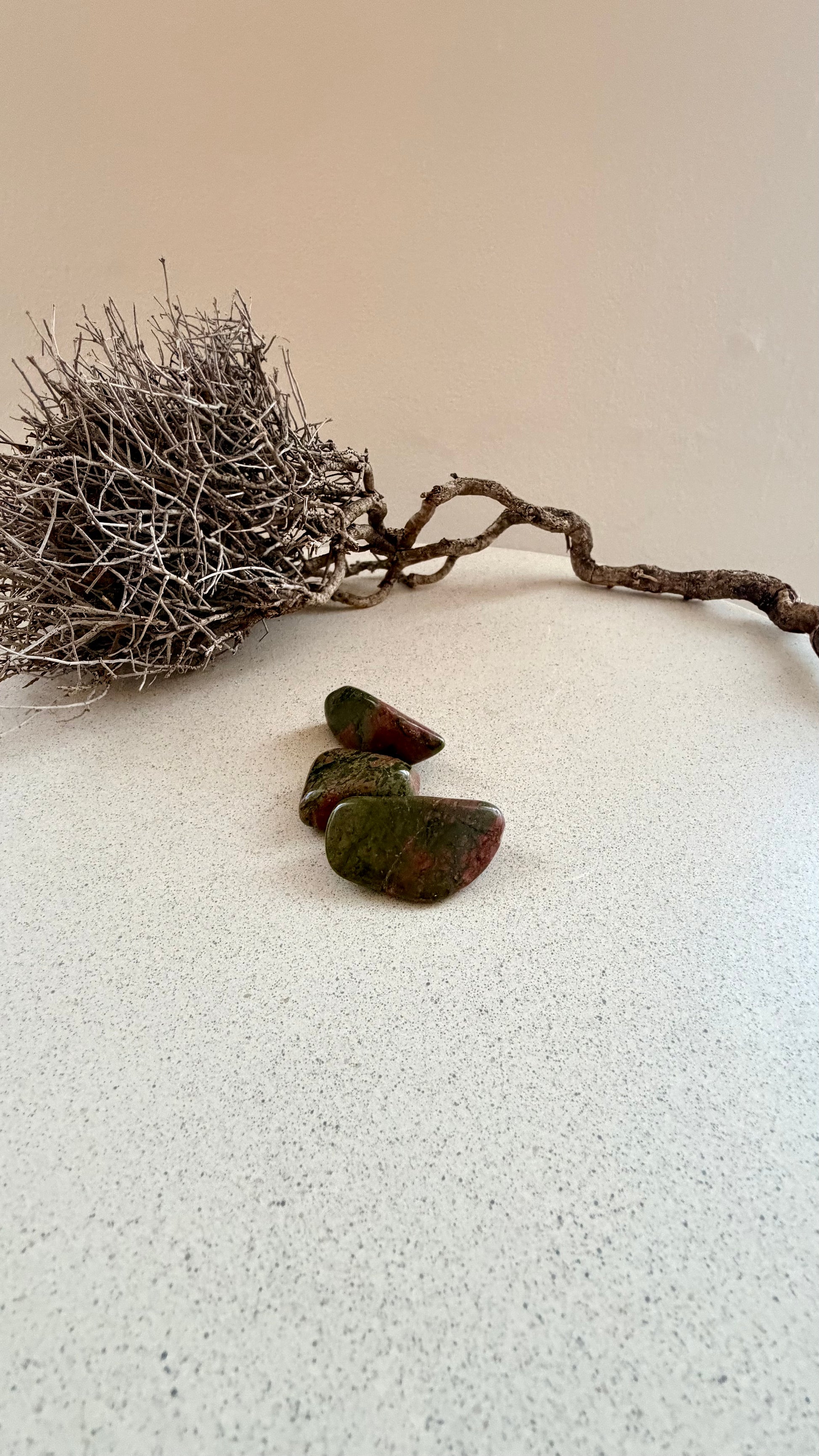 Unakit wird traditionell mit emotionalem Gleichgewicht und innerer Stabilität verbunden. Viele Menschen nutzen ihn, um alte Muster bewusster loszulassen und neue Schritte mit mehr Vertrauen zu gehen. Die Kombination aus Grün und Rosa erinnert daran, Herzöffnung und Erdung gleichzeitig zu leben.