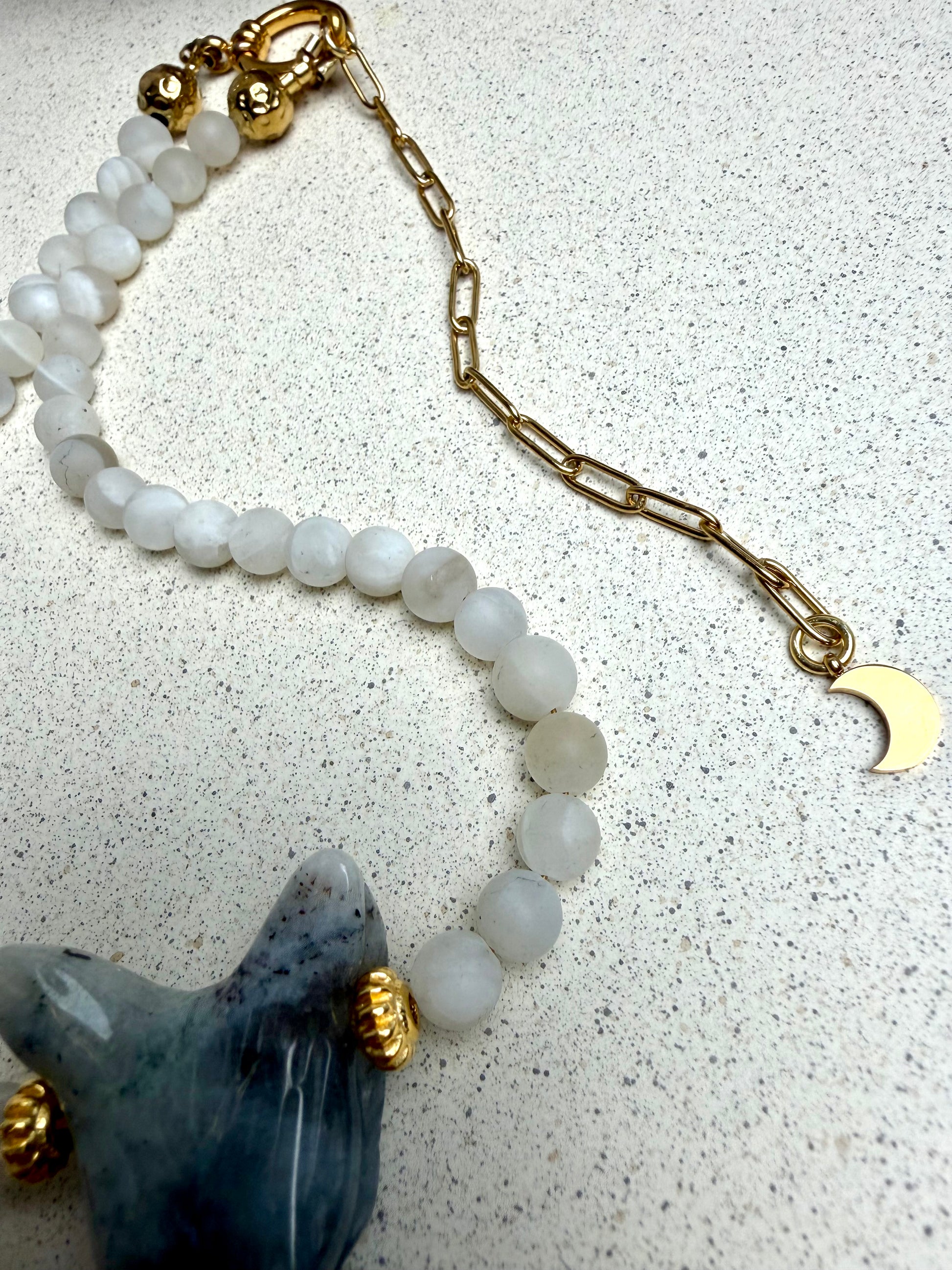 Diese Wolf-Whisperer Kette vereint Labradorit und weißen, matten Mondstein zu einem Schmuckstück, das dich zurück in deine Wahrnehmung führt. Sie ist für Frauen, die fühlen statt folgen – und die bereit sind, ihrer inneren Stimme wieder zuzuhören.